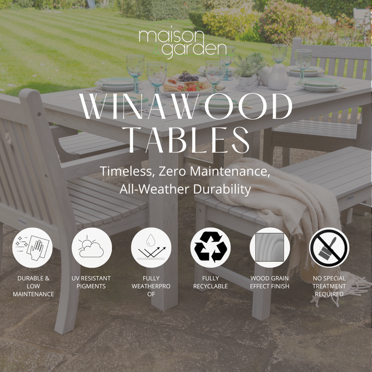 Elevate your outdoor dining with Winawood Garden Tables, now including our new round tables—the perfect centrepiece for any gathering. Crafted from recycled plastic, they offer a sustainable, long-lasting solution for your garden.