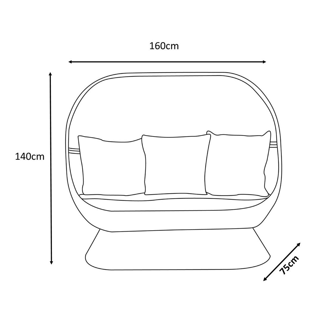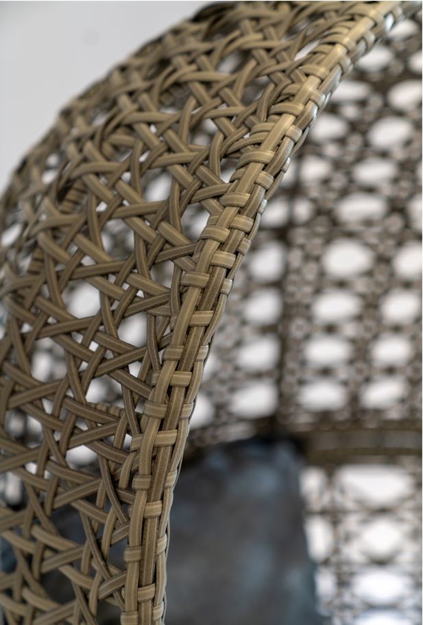 Double Rattan Cocoon Chair comes in an elegant light grey weave, with soft charcoal fabric cushions to the back and seat. The weave is UV resistant and is woven onto a sturdy, rust proof aluminium frame, meaning it can be left outside all year.