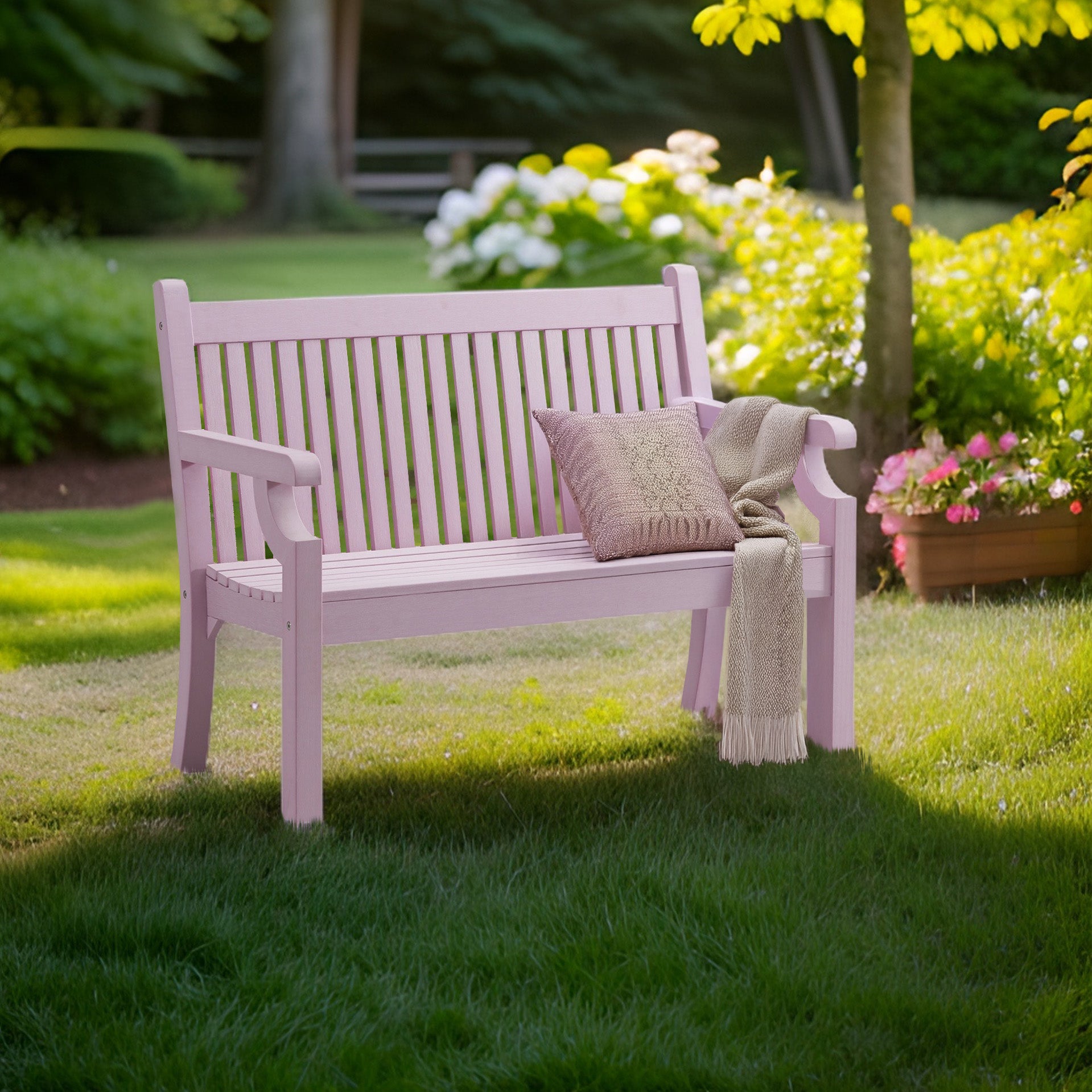 The bench has an authentic wood effect with grain, but the recycled polymer means it will not warp, will not rot and will never need to be stained or painted. All that is needed to maintain your bench is the occasional wipe down with some warm soapy water.